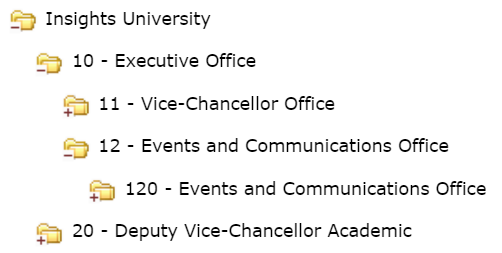 A structure can be thought of as a branch of the hierarchy in the model. Structures have icons that look like manila folders, and when clicked on they reveal the structures or objects contained within them. To roll them up simply click on the structure again. As in the example below, structures with a "-" have been clicked on and opened while those with a "+" are closed or 'rolled up'.