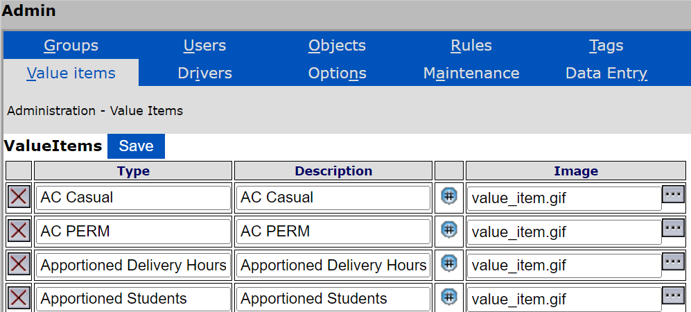Value items are defined within the Value Items tab of the administration section accessed through the admin button.