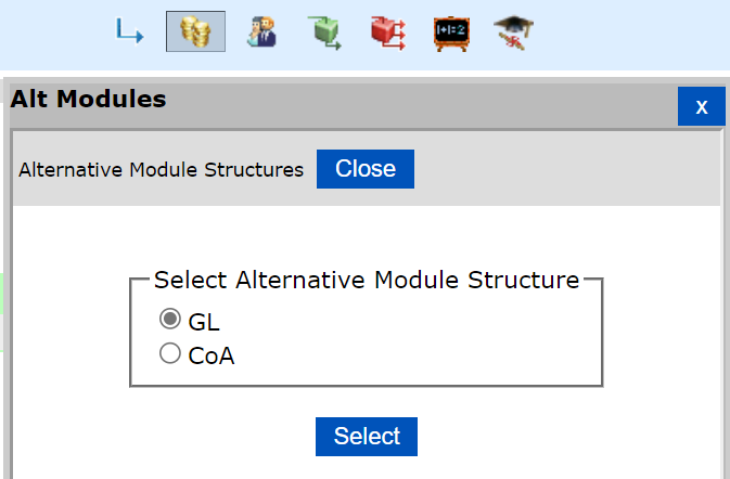 As well as the basic modules you can also define alternative layers and alternative module modules. Often this is done for the Resource module as the organisation may need to view expenses from both the point of view of the organisational hierarchy and the point of view of the accounts used. To access the alternate view, simply navigate to the module and then click on its icon a second time. A window will pop up allowing you to choose the view you want.