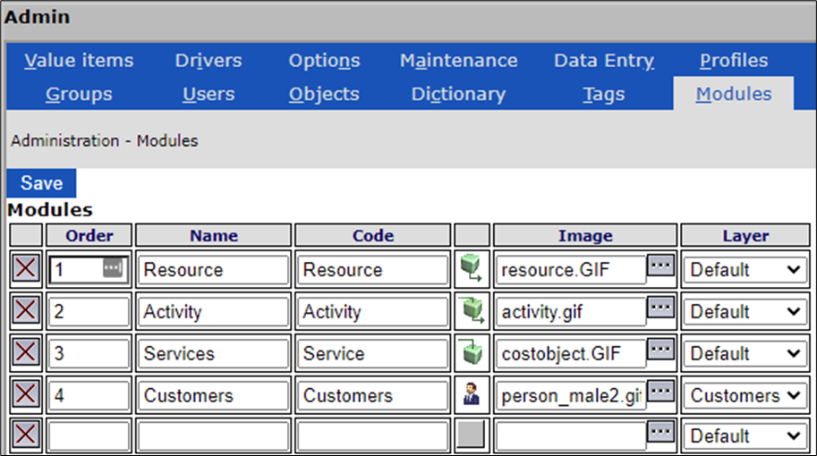 A module is a segment of the model that can be thought of as a participant in how the organisation turns transactions into products. At a minimum in an activities-based costing model, there would be a Resource or General Ledger module, an activities module, and a Services or Products module. e.g. for a bakery the transaction of buying/selling bread and ingredients would be held in the General Ledger module, which would be allocated to the activity of baking bread in the Activity module, which is then allocated to the product of bread in the Products module.